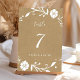 This wedding table number features a rustic floral botanical white wreath on a brown faux kraft paper background.