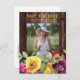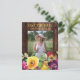 Rustic dark brown wood graduation Save the Date/Announcement postcard with colorful yellow and purple watercolor floral and space for your photo. Contact us for help with customization or to request matching products.