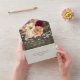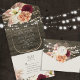 Romantic and rustic, this all-in-one wedding invitation features a barn wood background, glowing string lights, and a lush floral bouquet with blush, ivory, and burgundy blooms. Delicate feathers and soft botanical elements add a boho-chic flair, while elegant typography and neutral tones provide a sophisticated finish. Perfect for farmhouse, country, or outdoor weddings, this design includes an RSVP section and guest meal choices—all in one eco-friendly format.