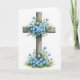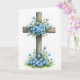 This design shows a weathered wooden cross standing upright, its grain and worn edges giving it a timeworn, caring presence like something tended by loving hands. Small sky-blue flowers with pale yellow centers spill gently over the crossing point and gather near the base, like a quiet bouquet offered in friendship 🌷. Soft green leaves curl around the stems in a loose, natural way, suggesting closeness and steady support without crowding the main shape. The background is bright white, leaving lots of open space that makes the wood and blossoms feel intimate and noticed. A short Easter greeting sits near the top in light gray lettering, with a smaller line beneath it in muted blue to echo the petals 🐇. The colors stay gentle and slightly washed, with subtle shading that makes the flowers look airy against the darker wood. The arrangement forms a calm vertical focus, with the densest cluster of blue blooms resting at the bottom edge of the cross.