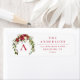 Perfect Christmas holiday return address label with burgundy red, cream and green floral watercolor wreath design with monogram in a modern font.