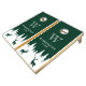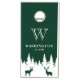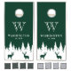 A rustic cornhole game set for the family featuring a white illustration of a deers with antlers in a forest of trees on dark hunter green background. You can personalize with your family initial, name and year established or whether it's your "mountain house," "mountain cabin, "hunting lodge," or something similar.
