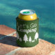 Rustic forest green can cooler featuring a camping theme with trees, a bear, and the phrase "Let's Go Camping". Your monogram letter in white is on the bottom.