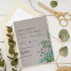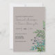 A charming botanical wedding invitation with a forest theme of green foliage leaves, berries and small branches on a pale, slate grey background. This simple, rustic design would be most suitable for a garden, spring, outdoor or botanical-themed wedding ceremony.