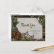 A rustic forest themed wedding thank you postcard for the mountain man and fairytale woodland sprite. This design features a background of rustic dark wood plank design and embellished with evergreen branches in cedar, fir, and elegant pinecones. Personalize by adding the name of the bride and groom and thank you message.