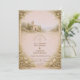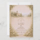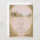A soft countryside garden scene featuring a romantic stone chapel, cypress trees, and gentle rolling hills framed by lush florals and greenery. The muted neutral palette and classic European-inspired landscape create a timeless, elegant look perfect for couples planning an outdoor or countryside celebration. This design blends rustic charm with refined details for a warm, romantic atmosphere that feels both intimate and enduring.