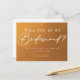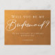 This rustic gold Will You Be My Bridesmaid postcard invitation features elegant white typography overlaid on an understated earth tone gradient. Simple light orange and brown hues follow the current fall trends for a bohemian wedding this autumn. Complete the look with your minimalist script over the color fade.