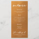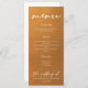 This rustic gold wedding dinner menu features elegant white typography overlaid on an understated earth tone gradient. Simple light orange and brown hues follow the current fall trends for a bohemian wedding this autumn. Complete the look with your minimalist script over the color fade on this course list.