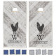Rustic gray barn wood shiplap family name monogram corn hole set featuring a handsome classic serif typeface and a country vintage farm hen silhouette. The unique feature of this corn hole set is a wood pattern set at a roughly 45 degree angle. Perfect for family reunions and family vacation cabin or cottage.
