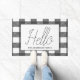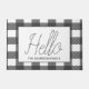 Rustic gray and white buffalo check plaid doormat with the word "Hello" in thin script. This mat can be personalized with your family's name!