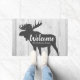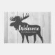 Gray large moose silhouette doormat with the word "Welcome" in white text as well as your family's name. The background is a weathered white gray wood planks print. Add some style and fun to your entryway with this rustic bold doormat.