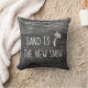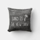 For the family that celebrates their holidays in the tropics, this pillow displays a cute palm tree icon with the sentiment fun "Sand is the New Snow." It features white chalk-styled typography set on a monochrome gray rustic wood background with twinkling string lights.