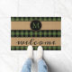 Fun doormat with contemporary black and green checkered plaid pattern on burlap background. Stylish rustic unique design with room to customize or personalize with your family name monogram. Original personalized monogrammed outdoor decor accent for decorating the front porch or yard of your country cottage house, log cabin, mountain lodge, fishing camp, lake or river vacation home.