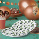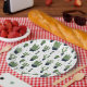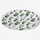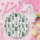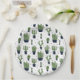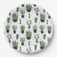 Paper plates with a rustic western flavor. Designed with a bunch of cute green cactuses in a repeating pattern. Specifically, green colored prickly cactus, in all kinds of shapes and sizes, each sitting in its own dark blue flower pot. Little decorative triangles in between them. Whimsical fun illustration.