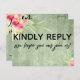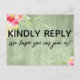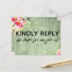 Both the back and front were accented with pretty, colorful watercolor flowers. In editable text "kindly reply" was placed, large and bold, on the front. In a modern casual handwriting, a graphic depicting "we hope you can join us!" appears below. On the back, the same unique font was used to create graphics that read "rsvp", "m", "kindly deliver to:" and "menu choice for each guest:" All other text is editable. Use the template fields to personalize as much as you wish. The background is covered in rustic green wood imagery. // 100 //