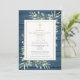A celebration of life photo remembrance invitation featuring greenery on a rustic blue wood panels background. Designed by Thisisnotme©