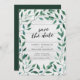 This rustic Save the Date card features Italian Ruscus with the words "save the date" in trendy script all against a pale wood background on the front and a dark green the back side.