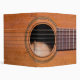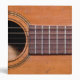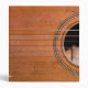 Detail guitar photo of strings and sound hole on a worn acoustic guitar.