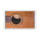 Detail guitar photo of strings and sound hole on a worn acoustic guitar.