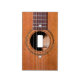 Detail guitar photo of strings and sound hole on a worn acoustic guitar.
