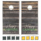 Happy Campers overlaying rustic dark wood print cornhole set.