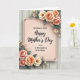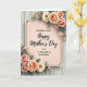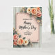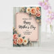 This design shows a blush-pink rectangular panel centered on the card, outlined with a thin dark border and small corner flourishes that add a gentle, affectionate touch ❤️. Across the middle, the larger line of text reads “Happy Mother’s Day” in black, with smaller supporting words nearby that address “A WONDERFUL STEP MOM.” The text sits neatly within the panel, creating a soft focus that feels like a caring note set aside just for her. In the upper right and lower left, floral clusters lean inward as if offering a quiet embrace, mixing peachy-pink roses with creamy white blossoms and tiny accent flowers 🌼. Muted green leaves curl around the blooms, and the shading gives the petals a tender, almost shared-glance warmth without needing extra decoration. The overall palette stays gentle and soothing, with dark lettering standing out clearly against the pink center. Behind everything, the background shows light wooden planks running vertically with subtle grain lines and faint seams between boards.