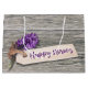 Modern Persian New Year illustration: Purple hyacinth with New Year "Happy Norooz" wishes on a rustic wooden background.