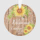 An elegant ,rustic yellow sunflower Happy Retirement tree ornament comprising of a brown wooden grain background decorated with a pretty floral watercolor yellow sunflower with a bee and a string of lights. The perfect gift to give to someone for their retirement. Personalize with a name and date of their retirement. Perfect for an office coworker, hospitial staff or any employee really.