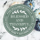 Happy Thanksgiving round return address sticker with your name and address in white stylish typography features the text BLESSED AND THANKFUL in handwritten typography with a stylish touch of rustic foliage on a green background. Also great for a business thank you to customers! Simply add your business name and address or website. Exclusively designed for you by Happy Dolphin Studio.