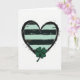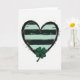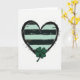 This greeting card features a large heart centered on a white background, outlined with a thick charcoal-black stroke that looks slightly rough and speckled, like textured paint. Inside the heart, horizontal stripes alternate between deep forest green and soft mint, with a worn, grainy look that makes the colors feel lived-in rather than flat. Near the bottom of the heart, an emerald three-leaf clover sits snugly as if it’s growing upward from the heart, adding a sweet St. Patrick’s Day touch ☘️. The contrast between the rugged outline and the smoother clover edges creates a gentle push-and-pull, like two close friends balancing each other’s energy. There’s no character scene, but the heart-and-shamrock pairing suggests closeness, as if the clover is tucked in for a quiet, affectionate moment 💚. No lettering appears on the front, leaving open space around the central image where a short greeting could be placed later in dark green or black if desired. The heart’s striped greens and the small clover at the base stand out sharply against the plain white field with scattered dark flecks around the outline.