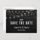 Rustic black chalkboard wedding save the date postcards featuring string lights on a black chalkboard background.