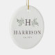 Your initial surrounded by festive branches along with last name and year or date of marriage. With a photo on the back, this ornament is perfect for the newlywed couple.
