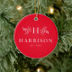 Your initial surrounded by festive branches along with last name and year or date of marriage in white against a red background (color can be edited by clicking "customize"). With a photo on the back, this ornament is perfect for the newlywed couple.