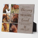 Equestrian tribute picture plaque featuring a rustic wood effect background, a 6 photo collage of your beloved animal, a sympathy quote that reads "your life was a blessing, your memory a treasure, you are loved beyond words & missed beyond measure", a paw print with a love heart, the name of the orse or pony, and their birth/death date. This country chic equine memorial plaque is easy to customize, and is the perfect sympathy gift for you, your family, or friends to honor those special pet horses who are no longer with us.