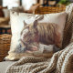 Decorator throw pillow with a rustic, country farm painting of a horse and child sleeping peacefully in a bed of hay.