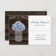 Rustic wedding RSVP response card featuring a mason jar with blue hydrangea flowers, hanging from string lights on a dark barn wood background.