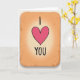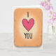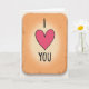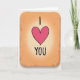 This greeting card shows a warm peachy-orange background with a lighter glow in the middle, like a softly lit sign. In the center, the message reads “I <3 YOU” in uneven black lettering that looks drawn by hand, with the words stacked neatly. The “<3” sits between the words and points to a bright pink heart that’s outlined in black and feels like the main focus 💘. The card’s design sits inside a tall rounded rectangle, and the edges look worn with little speckles and darker smudges. A faint shadow underneath makes it seem like the card is resting on a muted off-white surface. Overall, it feels simple, sweet, and full of affection, like a small reminder that love doesn’t need a lot of fuss ❤️😘.