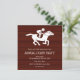Gallop into the racing season with this stylish Annual Derby Party invitation. Featuring a rustic wood-panel background, a classic white jockey silhouette, and a playful horseshoe pattern on the reverse, this design perfectly captures the spirit of the track. Ideal for hosting a themed event with Mint Juleps and Derby attire, this customizable card ensures your guests save the date for the most exciting two minutes in sports.