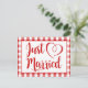 This cute wedding postcard features a timeless red and white check design highlighting a Just Married announcement printed in a fancy calligraphy red font with a cute hand drawn heart.
