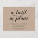 This is the modern minimal clean rustic Kraft design themed, in Black font, Wedding party invitation Rescheduled (postponed / postponement) postcard (A twist in Plans) . It is the perfect and elegant way to make the reschedule announcement to your friends and family.