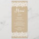 Wedding menu cards feature "Menu" in script, a charming illustrated border design of white floral and dotted lace, and a background with a rustic kraft brown paper textured appearance.