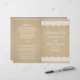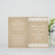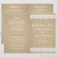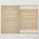 Charming white lace trim borders a warm kraft background on this rustic ceremony program. "Celebration of Love" appears in elegant script, framing your names and wedding details for a romantic country-inspired look, with a coordinating lace-trimmed backing. Inside pages are fully customizable for your bridal party, ceremony order, and a personal thank you message on the back cover. Programs are printed on text-weight paper and arrive flat, requiring a simple center fold.
