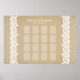 Wedding seating chart poster features a charming illustrated border design of vintage white floral and dotted lace, and a background with a rustic kraft brown paper textured appearance.