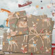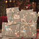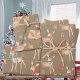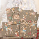 A rustic kraft colored Christmas holiday wrapping paper featuring baby reindeer at a holiday party with bows, berries, and gold stars.