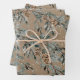 A neutral winter holiday wrapping paper featuring a rustic kraft paper color background with watercolor-painted juniper tree branches with cones; all three sheets are the same.