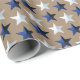 A rustic kraft wrapping paper for the Christmas holiday featuring bright navy blue and silver white stars in a repeat pattern on a warm kraft paper.