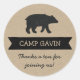 Kraft brown and black woodland camping birthday party thank-you favor stickers with a rustic texture. Includes an image of a bear, personalized with your child's "camp" name, and a customizable message that currently reads "Thanks a ton for joining us!"