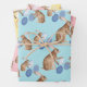A luxurious heavyweight wrapping paper featuring watercolor painted Easter bunnies sharing their colorful egg hunt finds on Easter colored background colors.
