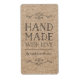 Stylish rustic vertical label with the words "Handmade with Love" between flourishes all in dark gray against a kraft like pattern background. This handmade label is ideal for crafters and makers of handmade goods, like artists, knitters, dressmakers.