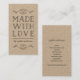 Stylish rustic vertical social media kraft business card with the words "Made with Love" between flourishes all in dark gray. This stylish handmade business card is ideal for crafters and makers of handmade goods, like artists, knitters, dressmakers, etc who want a way to let the people they meet in real life know how to find them and their work/portfolio online and on social media. This versatile card can also be used as a product tag for your handmade goods.